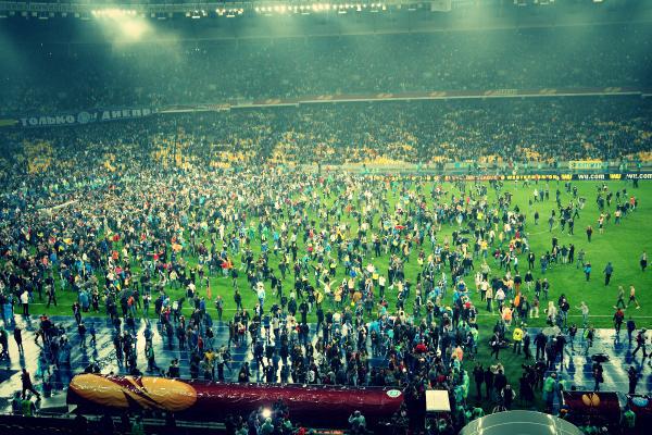В Киеве 14 мая прошел ответный полуфинальный матч Лиги Европы УЕФА, в котором днепропетровский "Днепр" принимал итальянский "Наполи" и выиграл со счетом 1:0. По сумме двух матчей "Днепр" выиграл с общим счетом 2:1 и вышел в финал турнира.