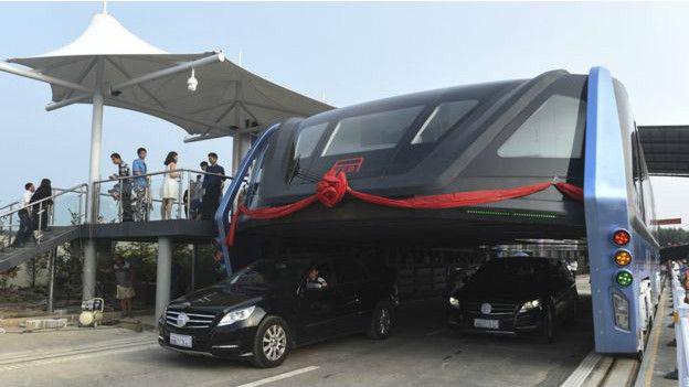 Рельсы автобуса, работающего на электричестве, размещенные вдоль обочин дорог, а сам автобус имеет форму, которая позволяет автомобилям двигаться под ним. Его высота - 2 метра, длина - 21 метр, а ширина - 7,5 метра. Автобус может перевозить до 300 пассажиров.