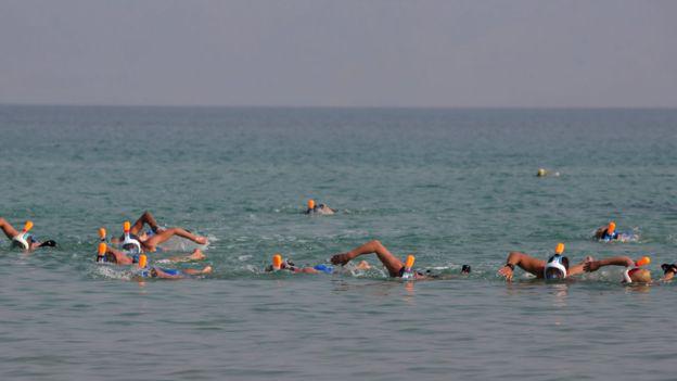 Более 20 пловцов из разных стран, включая Израиль и Палестинскую автономию, Южную Африку и Новую Зеландию приняли вызов.